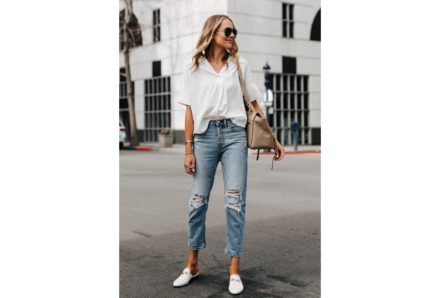 Nothing beats jeans and a tee when you‘re going for that perfect casual day look. And the great thing is it doesn‘t get any better than high-waisted, straight-leg jeans in a medium wash. It just doesn‘t. They look good on literally everyone, and they go with everything. Tuck in a white tee, slip on some white kicks, and there you go.