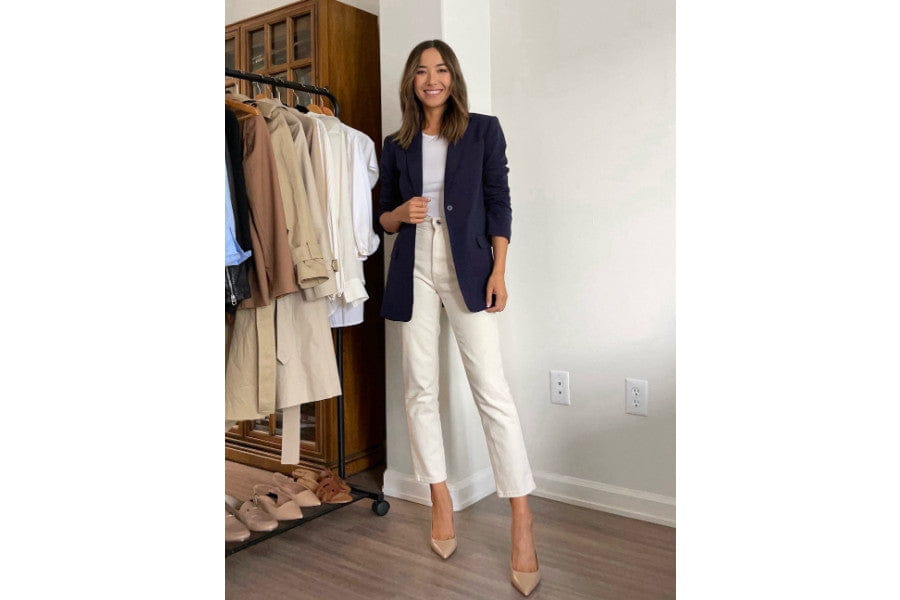 You can't go past a good blazer for those 'smart casual' office days. Team a navy blazer with a white blouse and tailored white pants – it's professional but still friendly. The best part about this outfit is that it works just as well after 5 pm – simply take the blazer off, and you're good to go.