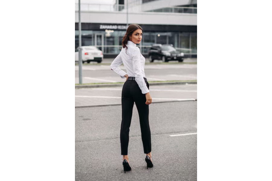 The secret to this look is all in the fit. Your trousers must skim your body, not too tight, and finish just above your ankle. The white shirt should be crisp (a hand-held steamer will take seconds) and tucked neatly. Wear black loafers for an androgynous edge and have a comfortable day at the office.Â