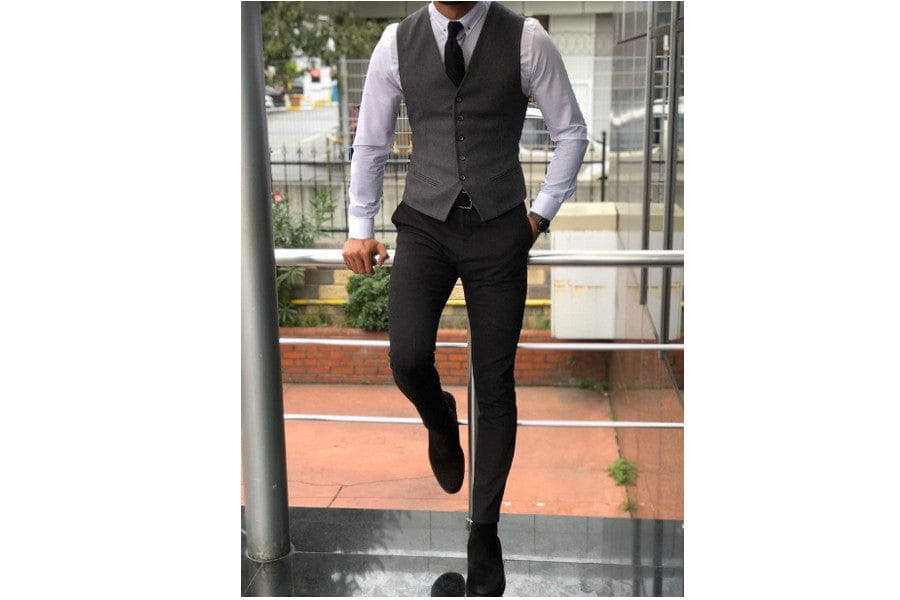 The gray gilet in the picture is a slim, fitted style with a button front. It looks smart worn over a white long-sleeve shirt and adds an element of chic to this classic old money style.