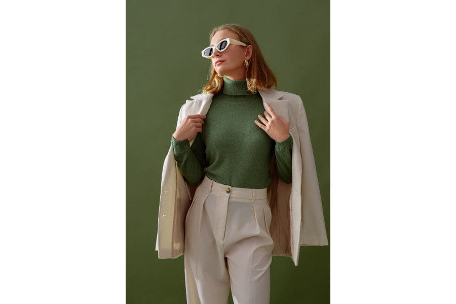 Here, you see a lady wearing a turtleneck sweater tucked in high-waisted trousers, an over-the-shoulder coat worn atop, and oversized hoop earrings. Very sleek, refined, and high-class-looking outfit. This here is the definition of understated luxury.