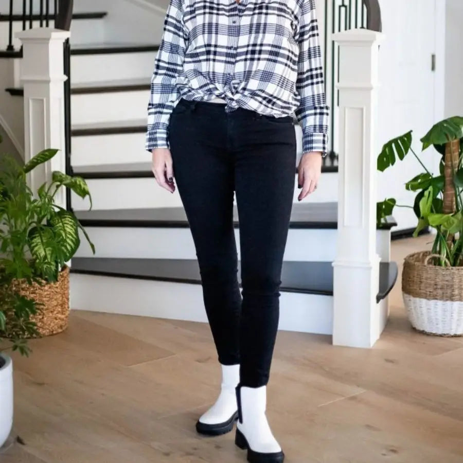 Plaid shirts are an excellent means to introduce texture and pattern to a black jeans outfit. Wear the shirt unbuttoned over a plain tee for a laid-back vibe, or button it up for a more refined look. Boots or casual sneakers complete this versatile ensemble, making it perfect for autumn or informal outdoor events, illustrating diverse ways to style black jeans.