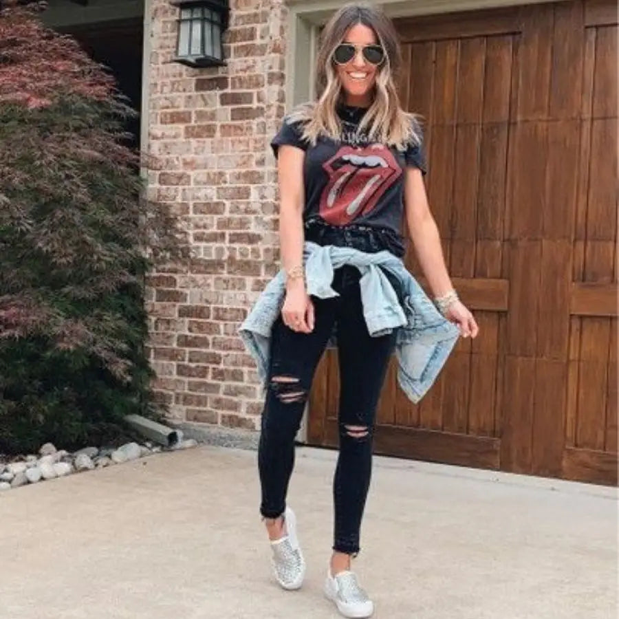 For a casual yet edgy ensemble, pair black skinny jeans with a graphic tee. A knotted tee at the waist adds a modern touch, while white sneakers or ankle boots complete the look. Enhance the coolness factor with a leather jacket. This black jeans outfit for women is perfect for casual meetups, errands, or concerts. A backpack or crossbody bag serves as a practical and stylish accessory.