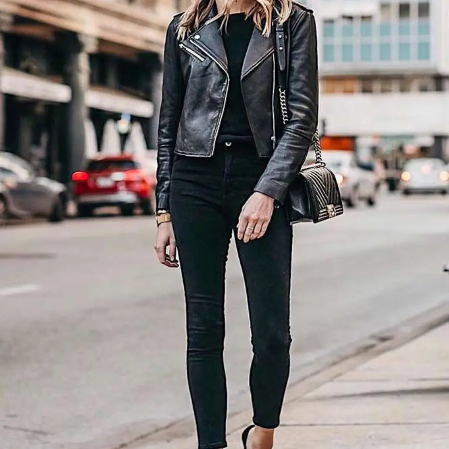 For a bold and edgy statement, combine black jeans with a black leather jacket. A fitted tee or tank top underneath maintains a streamlined profile. Combat boots or chunky sneakers reinforce a rebellious attitude. Silver jewelry, such as hoop earrings or layered necklaces, can further accentuate this daring look, making it perfect for nights out or casual social gatherings.