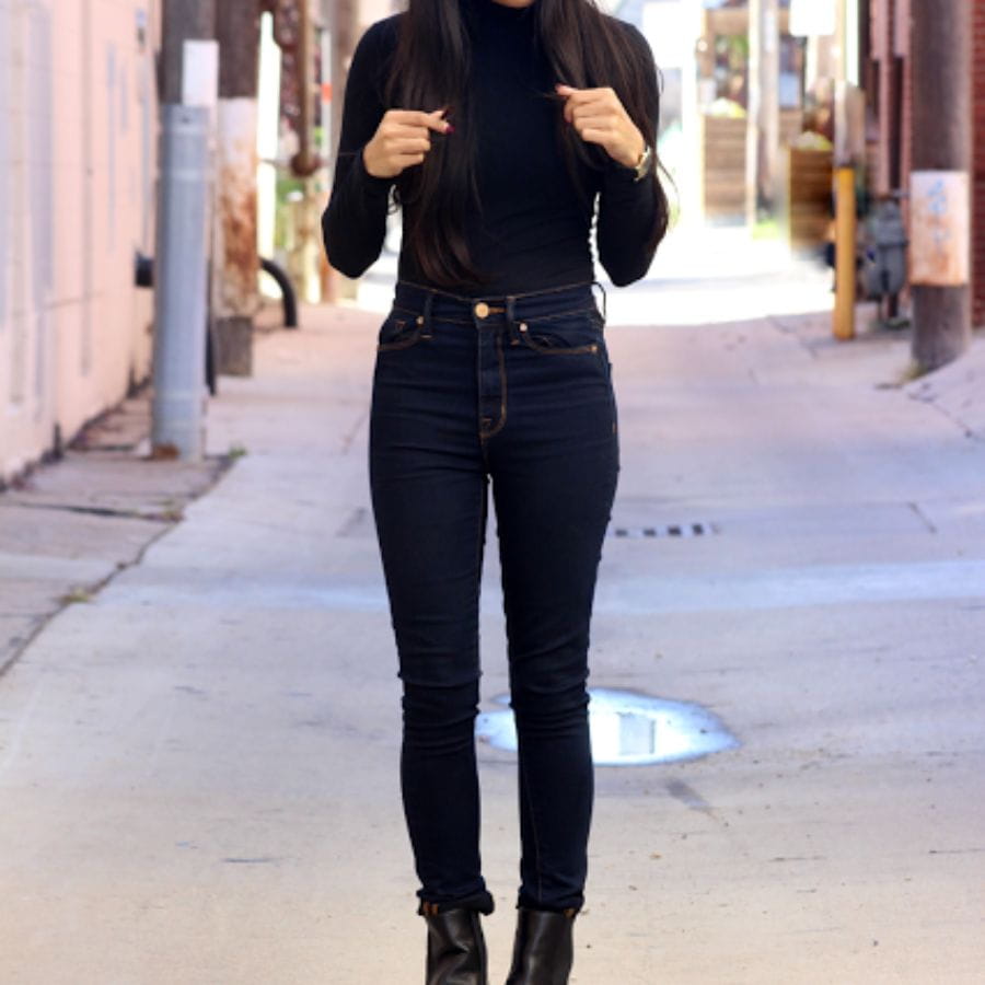 A fitted turtleneck offers a flattering and sophisticated option among tops to wear with black jeans. Opt for solid colors like black, white, or burgundy to maintain a sleek aesthetic. Pair this with heeled boots and a long coat for added elegance. This ensemble, ideal for fall or winter, exudes a chic and polished appearance, showcasing how to wear black skinny jeans for a refined look.
