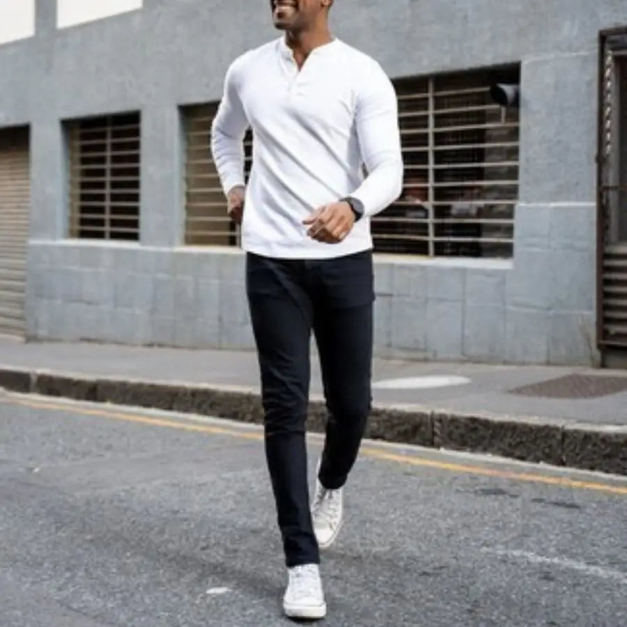 For a contemporary 2025 trendy look, pair black jeans with a Henley shirt. Rolling up the sleeves imparts a relaxed and casual feel, while boots or casual loafers complete the ensemble. This versatile outfit is well-suited for informal dinners, outdoor activities, or relaxed professional environments, demonstrating how to wear black jeans with modern appeal.